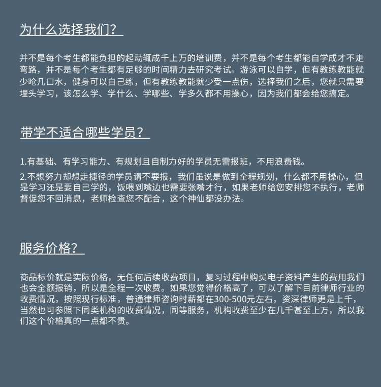 2025年法考全程辅导 VIP一对一辅导课程 法律职业资格考试辅导 法考课程,线下课程 好评度: - 学分:- ¥19800 课程介绍 课时目录 评论(0) 课程简介 本课程是收费课程,19800元,2025年考试结束后授权失效。 课程旨在帮助法考的同学节省复习时间、提高复习效率,争取在最短的时间内拿到最高的分数。 0 0 投票 课程评分 登录 请登录后发表评论 0 评论 内联反馈 查看所有评论 相关课程 2026年中国政法大学 法学考研专业课 VIP一对一辅导课程 ¥9998 详情 2026年法硕考研辅导课程 VIP一对一辅导课程 法硕考研在线课程 ¥998 详情 2025年法考全程辅导 全程督学课程 法律职业资格考试在线课程 ¥998 详情 2025年法考全程辅导 冲刺提高课程 法律职业资格考试在线课程 ¥998 详情 2025年法考全程辅导 基础强化课程 法律职业资格考试在线课程 ¥998 详情